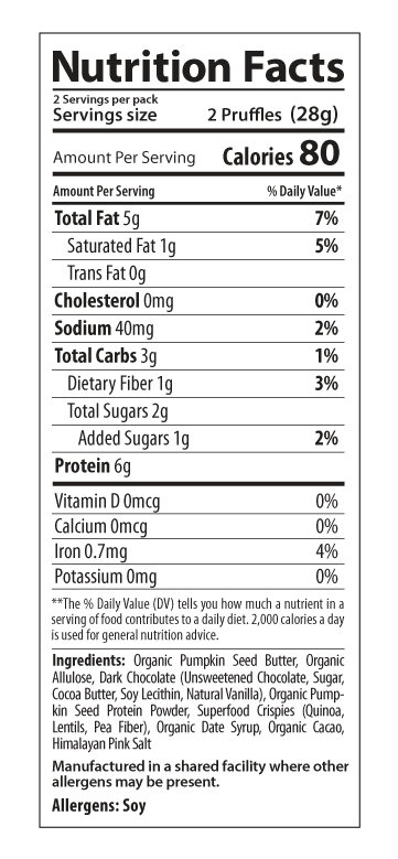 With only 2g of sugar and 6g or protein, this is the ultimate crunchy, creamy treat for any occasion. Pop a Pruffle (or whole bag) whenever you need a satisfying treat.